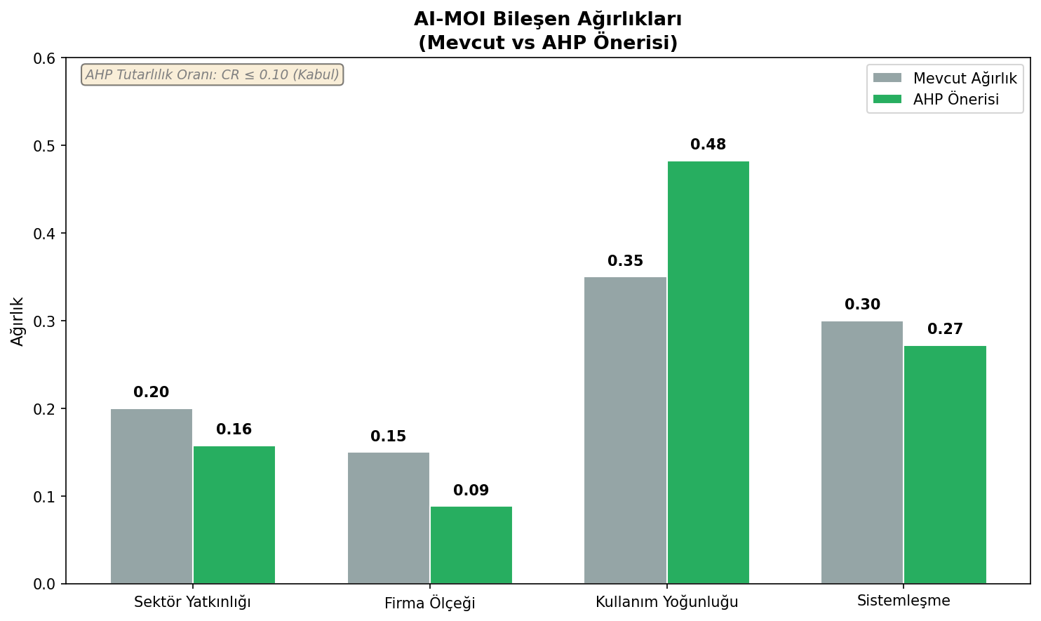 Bileşen ağırlıklarını doğrular. Tutarlılık oranı CR≤0.10 sağlandı. Kullanım Yoğunluğu (0.48) en yüksek ağırlığa sahip, Sistemleşme (0.27) ikinci sırada.