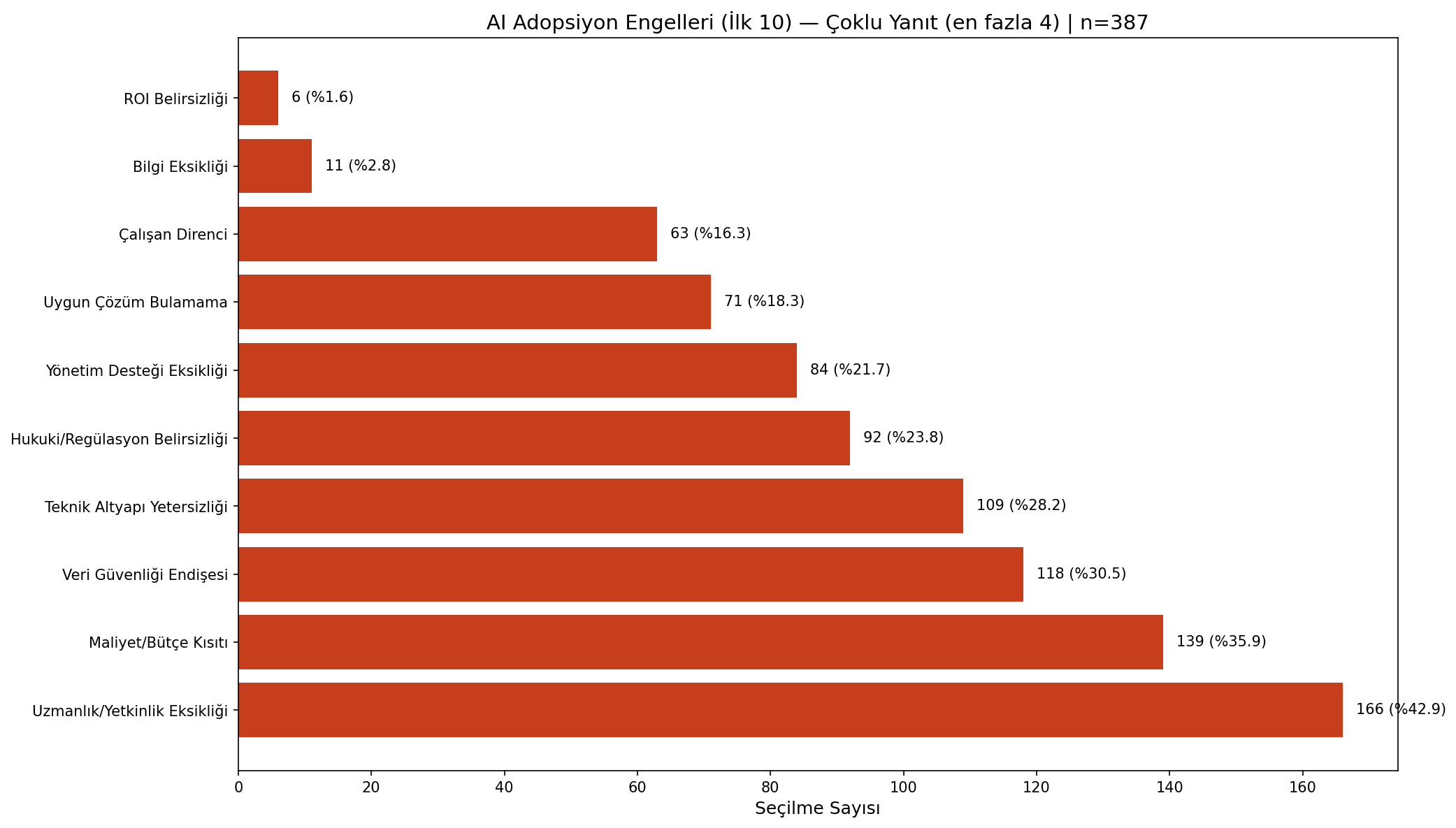 Firmaların %42.9'u (166 firma) AI adaptasyonunda en büyük engel olarak uzmanlık/yetkinlik eksikliğini gösteriyor.