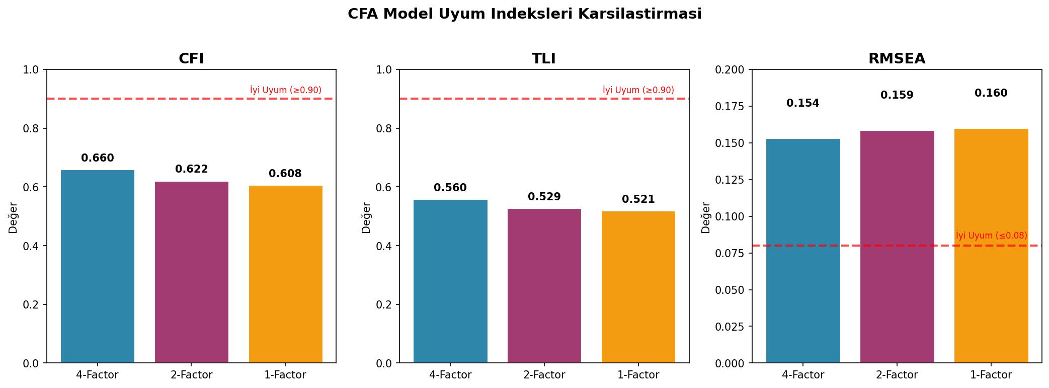 Teorik modelin veriye uyumunu test eder. 4-faktör modeli en iyi uyumu gösterdi (CFI=0.74, TLI=0.67, RMSEA=0.13). Küçük örneklem nedeniyle uyum orta düzeyde.