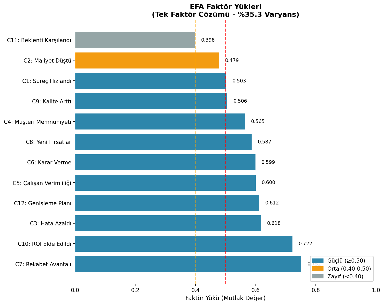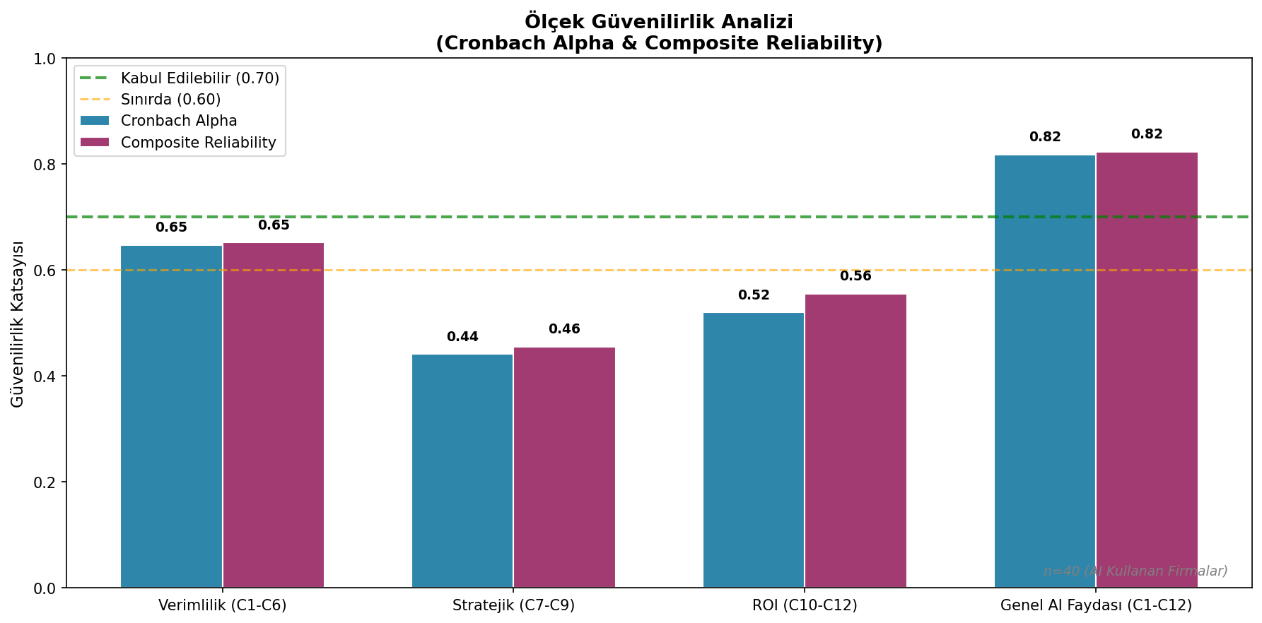 İç tutarlılığı ölçer. Genel ölçek α=0.826 (iyi), Verimlilik α=0.641, ROI α=0.516. Alt ölçeklerde düşük değerler, madde sayısı ve örneklem boyutundan kaynaklanmaktadır.