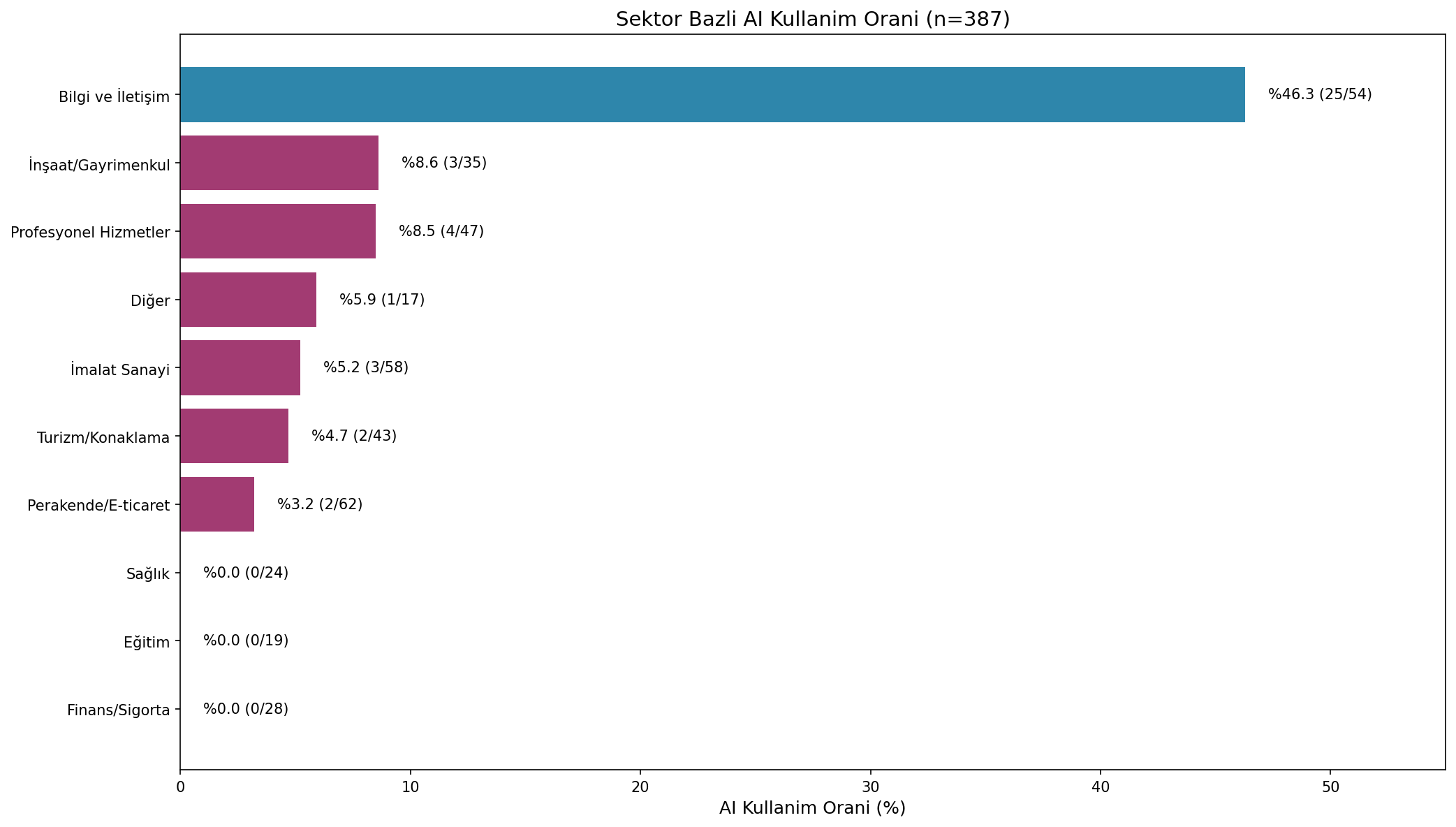 Farklı sektörlerde AI kullanım oranları. Bilgi-İletişim sektörü lider konumda (%46.3)