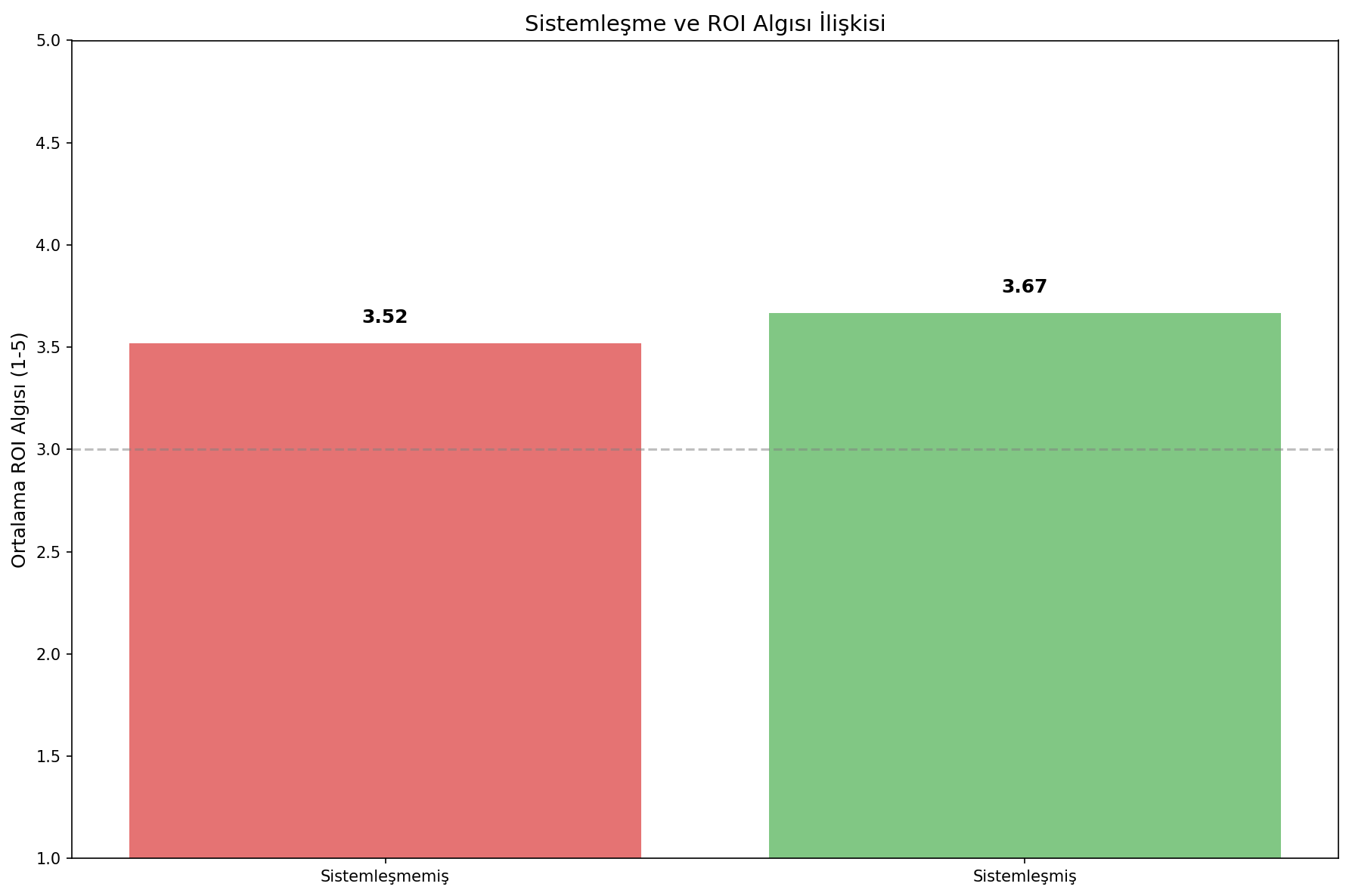 Sistemleşme düzeyi ile ROI algısı arasındaki ilişki. SOP uygulayan AI kullanan firmalar: %8.6 (3/35)